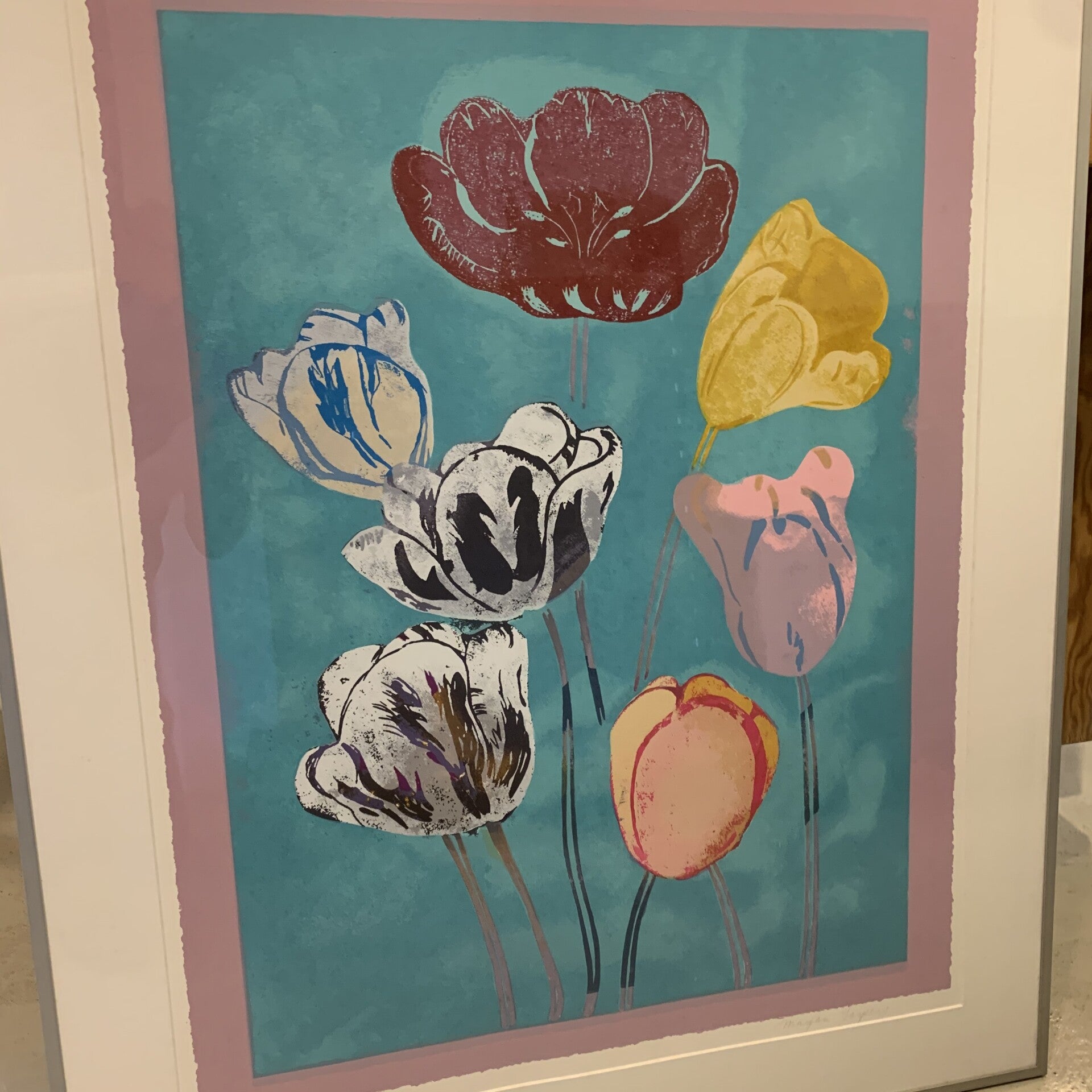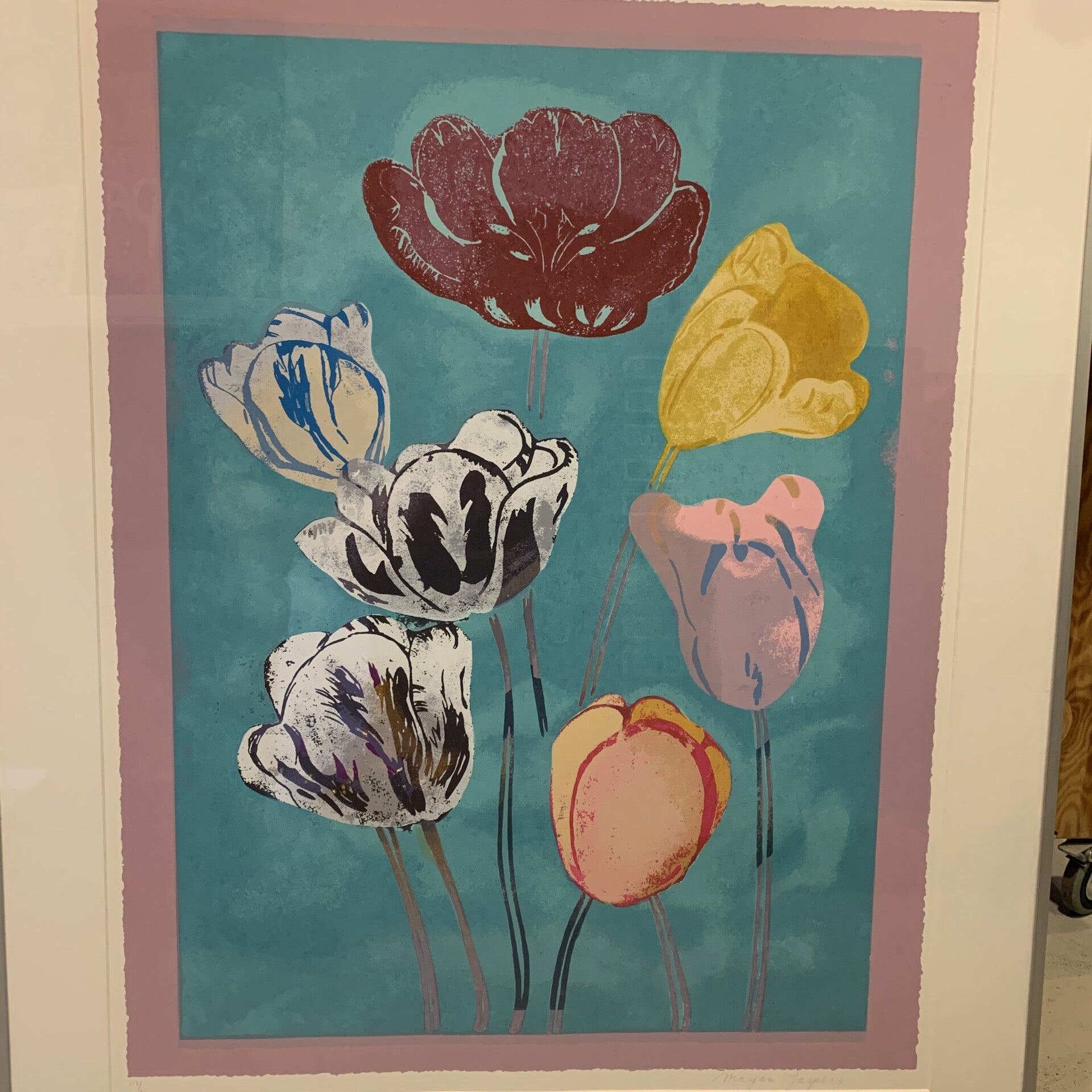 Titel: (bloemen tegen blauwe achtergrond)